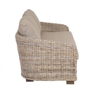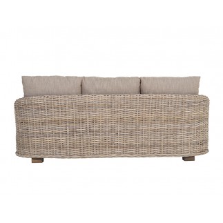 Sofá de 3 plazas de ratán natural en color gris envejecido y patas de madera. Destaca por sus cojines tapizados en color beige tanto en asiento, como respaldo y reposabrazos. Incluye cojines decorativos a juego.